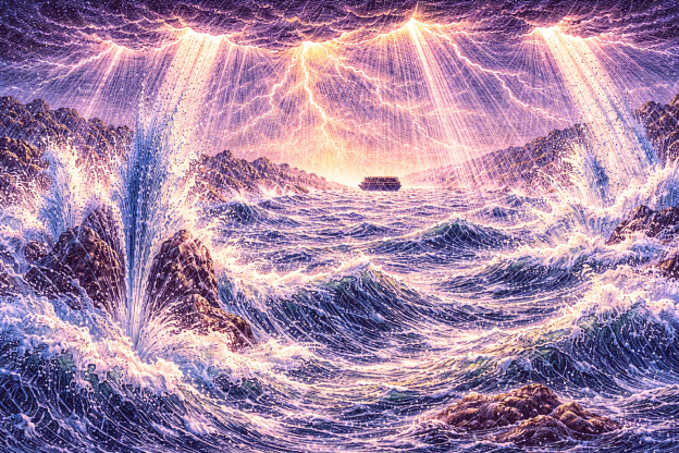 Puesto que toda esta maldad es un retorno al desorden y la falta de forma de antes de los seis días de creación, cuando Dios viene en juicio simplemente completa la des-creación de la creación que la maldad había producido. Rasga el manto protector, abriendo ventanas en él, y hace llover durante cuarenta días y cuarenta noches. Rasga la tierra seca y hace que las fuentes del abismo estallen durante cuarenta días y cuarenta noches. Como resultado, la creación retorna a la masa acuosa e informe de antes de los seis días de creación. Al menos, esto es todo lo que se ve durante 150 días. Dios completa la des-creación que todo el pecado había causado.