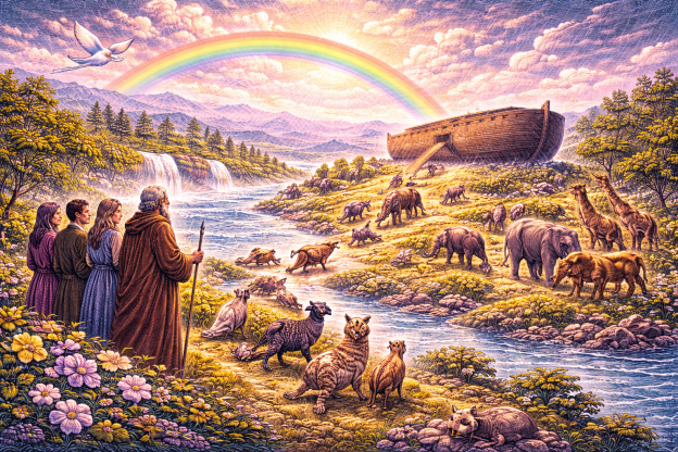 Esto se confirma cuando comparamos la obra de re-creación de Dios con su obra de creación descrita en Génesis uno. Después de que Dios hizo pasar un viento sobre la tierra de modo que las aguas comenzaron a menguar, hizo que las criaturas vivientes en el arca la dejaran y comenzaran a repoblar la tierra, recordándonos la manera en que Dios pobló el cielo y la tierra con criaturas vivientes durante los días quinto y sexto de la creación. En Génesis ocho leemos acerca de Dios restableciendo los días y las estaciones, recordándonos el día cuatro de la creación cuando puso las lumbreras en el cielo para señalar las estaciones, los días y los años. En Génesis nueve leemos que Noé y sus hijos son bendecidos y se les manda ser fructíferos y multiplicarse, llenar la tierra y señorear sobre ella. En Génesis uno leemos sobre este mismo mandato dado a Adán y Eva. En Génesis nueve leemos que Dios provee alimento a Noé y su familia. En Génesis uno hizo lo mismo por Adán y Eva.
