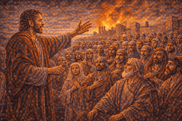 Pedro está apacentando el rebaño. Las ovejas perdidas de Israel están reunidas y, en la fortaleza del Espíritu Santo, Pedro les explica que Jesús, a quien ellos crucificaron, es su única esperanza de salvación.